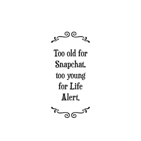 479-SFT0106This luxurious 27" x 18" 100% cotton flour sack towel brings sophistication to the home, crafted with black and white text that reads, "Too old for Snapchat, too young for Life Alert". An exclusive and timeless piece, it ensures effortless style and comfort with every use.