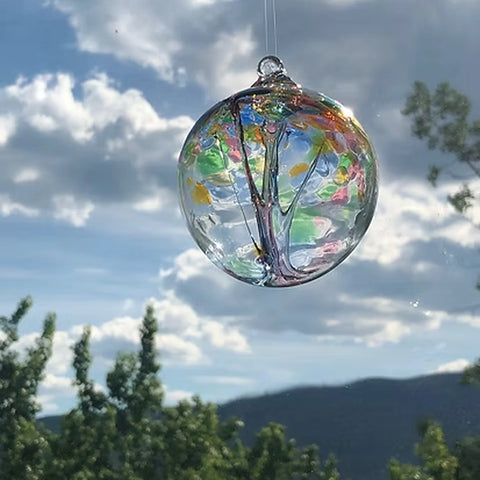 The Tree of Friendship is a hand-blown glass ornament created to celebrate connection, loyalty, and shared moments. Inside the clear glass orb, fine strands of molten glass form the trunk and branching limbs, while colourful glass accents represent the many bonds and experiences that grow over time.