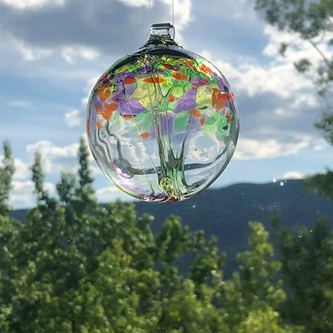 The Tree of Life is a hand-blown glass ornament inspired by growth, balance, and connection. Inside the clear glass orb, delicate strands of molten glass form the trunk and branching limbs, while vibrant, colourful glass accents represent the leaves and the interconnected nature of life.