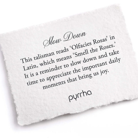 This talisman reads Olfacies Rosas in Latin, which means Smell the Roses. It is a reminder to slow down and take time to appreciate the important daily moments that bring us joy.