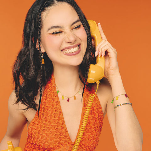 This is a must-have for fans of the famous jelly bears: this charm pendant from the THOMAS SABO x HARIBO collection comes in the shape of the goldbears. This design made of recycled silver and white, high-quality glass is just as sweet as the original. With this colourful, unique charm you can embellish individual bracelets, necklaces or hoop earrings, and combine the white HARIBO goldbears with further designs that reinterpret the popular fruit gummies. With this charm, you recall childhood memories and perfectly complement your Y2K look.