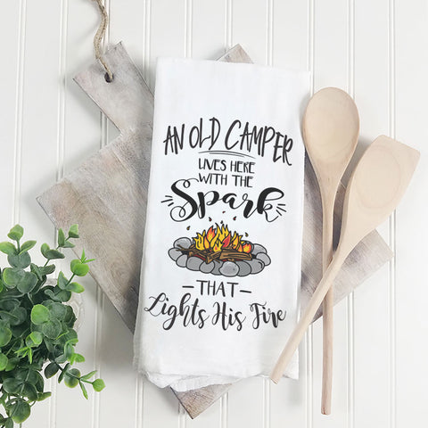 036-AOThis luxurious, 100% cotton towel boasts a modern yet whimsical digitally printed design, adding a touch of sophistication and liveliness to any kitchen. Perfectly sized at 18" wide and 29" high, it's absorbent to tackle any kitchen task with ease. An Old Camper Lives Here | Towel is the perfect combination of form and function.