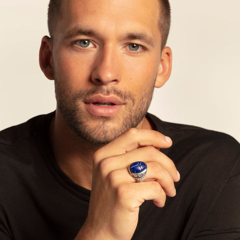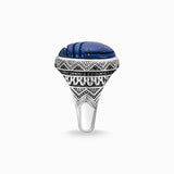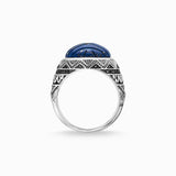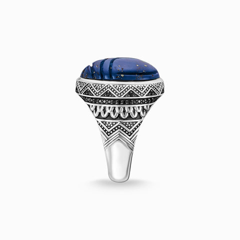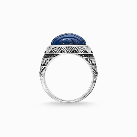 This hand-finished, richly decorated signet ring is a lucky charm inspired by the traditional silversmithing and characteristic blue of the Saharan nomads. As a centre stone, a hand-cut and imitation lapis lazuli with a scarab motif attracts every glance. This jewelry item combines the mysticism of the desert with the individual Thomas Sabo Rebel at heart, down to the last detail.