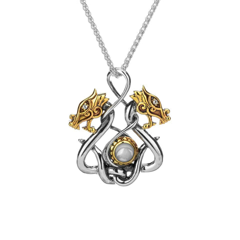 PPX6105-WTThis Silver and 10K Gold Double Headed Dragon Pendant is a stunning piece of jewelry that is sure to turn heads. Crafted with precision and attention to detail, this pendant features two intricately designed dragon heads facing away from each other, creating a bold and striking look.
