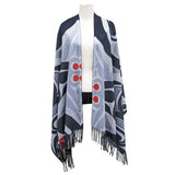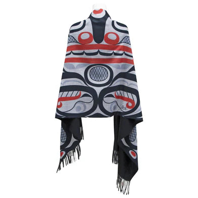 18076This luxurious art print shawl boasts the stylish Killer Whale Crosshatch design from Kwakwaka’wakw artist Curtis Wilson. Representing strength and power, this shawl will wrap you in elegance and exclusivity, as well as optimal warmth and comfort. Crafted with durable, soft, and beautifully draping 100% acrylic and measuring 180cm x 70cm, this shawl will be the perfect finishing touch to any look.