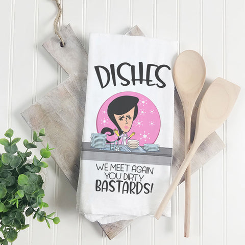 036-DBSay goodbye to boring dish towels and welcome the Dirty Bastards towel to your kitchen. This 18"w x 29"h, 100% cotton towel is digitally printed so the design becomes part of the fabric with no raised letter feel. The soft fabric makes it perfect for drying dishes and adding a touch of style.