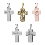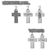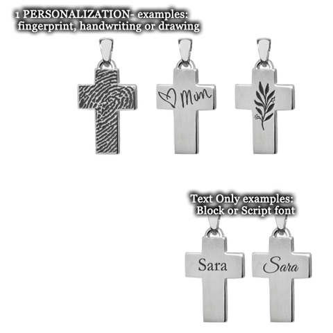 PER-3541Decorate the front or back of this spiritual favorite with a fingerprint, standard handwriting, graphic or name in script or block font. This petite cross pendant is the perfect size to adorn a chain or bracelet. This pendant is too small to accommodate a photo.