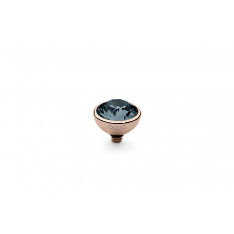 This Qudo 10mm Bottone Top has a Denim blue Swarovski Gem in a 14ct. Rose Gold Plated Stainless Steel Case. Easily twist on and off the tops to suit any outfit.