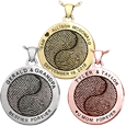 Two fingerprints intertwine to create this Yin Yang design- symbolic of a marriage or special bond between two people. You may add custom text to the front for an additional cost. This pendant may be customized on the back with your choice of options for an additional cost. Choose a double compartment for a dual memorial.