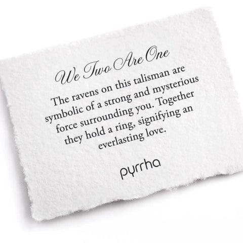 The ravens on this talisman are symbolic of a strong and mysterious force surrounding you. Together they hold a ring, signifying an everlasting love.